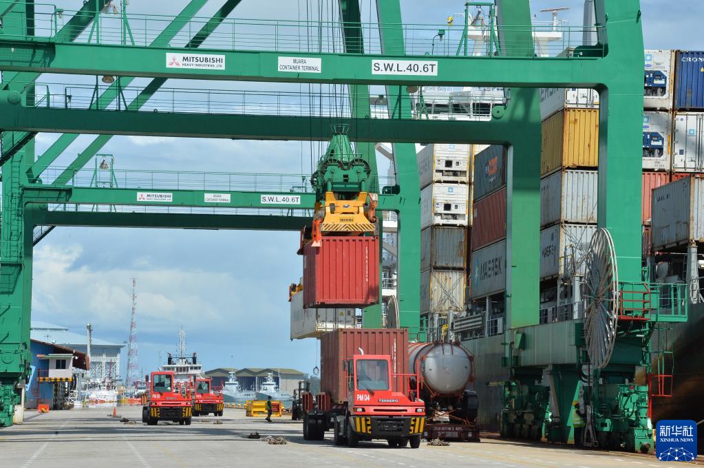 这是2022年1月1日拍摄的正在进行集装箱装卸作业的文莱摩拉港码头。文莱摩拉港由中国和文莱合资企业——摩拉港有限公司运营。新华社发(杰弗里·黄摄)