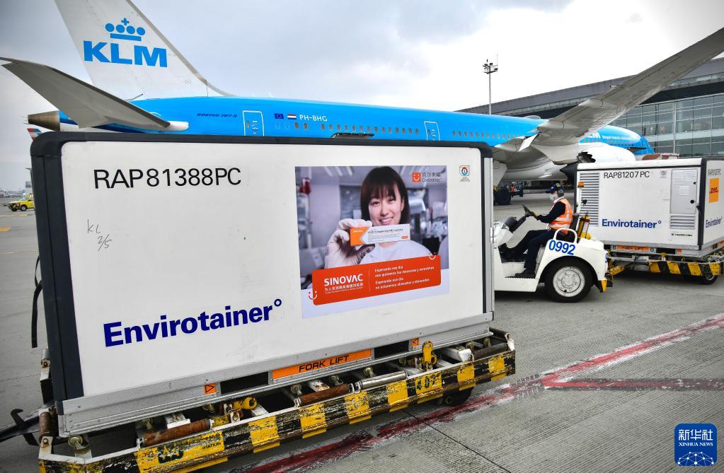 这是2021年3月6日在哥伦比亚波哥大埃尔多拉多国际机场拍摄的刚刚完成卸货的科兴疫苗。新华社发(哥伦比亚总统府供图)