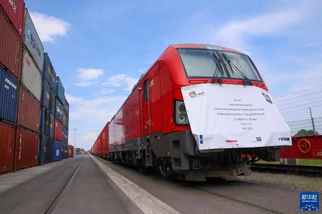 这是2021年6月4日,首趟从中国江苏南京至荷兰蒂尔堡的中欧班列抵达荷兰蒂尔堡。新华社记者 郑焕松 摄