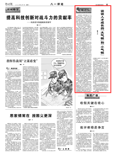 积极营造人才发展良好生态环境,需要“大气候”,也需要“小气候”。“小气候”对于人才成长和发展影响甚至更为直接具体。当前,个别单位的“小气候”营造得不够好,与单位领导在人才工作上的思想观念有较大关系。比如,有的单位还在沿用过时的方式管理官兵,有的照搬现役人员模式管理文职人员,有的套用基层连队方法管科技创新团队,这些都极大束缚了人才的手脚,遏制了人才的活力。