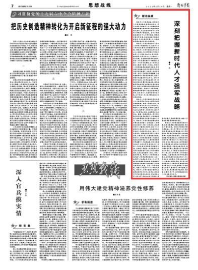 新时代人才强军战略,是新时代人才强国战略的重要组成部分,是习主席关于新时代人才工作新理念新战略新举措在国防和军队建设领域的深化展开,为全面做好新时代人才强军工作提供了战略指引。我们必须深刻把握新时代人才强军战略,增强使命感和紧迫感,加快锻造德才兼备的高素质、专业化新型军事人才,为推进强军事业提供引领和支撑作用。