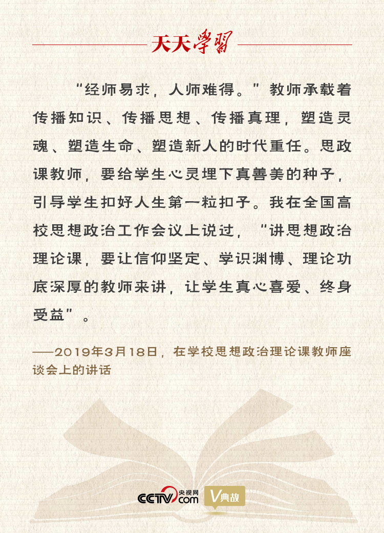 党的十八大以来,以习近平同志为核心的党中央高度重视学校思想政治工作,在加强思政课教师队伍建设等方面作出了重大决策部署。2016年12月,在全国高校思想政治工作会议上,习近平总书记强调,“思想政治理论课要坚持在改进中加强,提升思想政治教育亲和力和针对性,满足学生成长发展需求和期待”。2019年3月18日,习近平总书记主持召开学校思想政治理论课教师座谈会并发表重要讲话,深刻回答了学校思政课建设的一系列重大理论和实践问题。在讲话中,他引用“经师易求,人师难得”这句古语,强调思政课教师队伍建设的重要性,并对提高思政课教师素养提出六点要求,为推进思想政治理论课建设指明了前进方向、提供了根本遵循。
