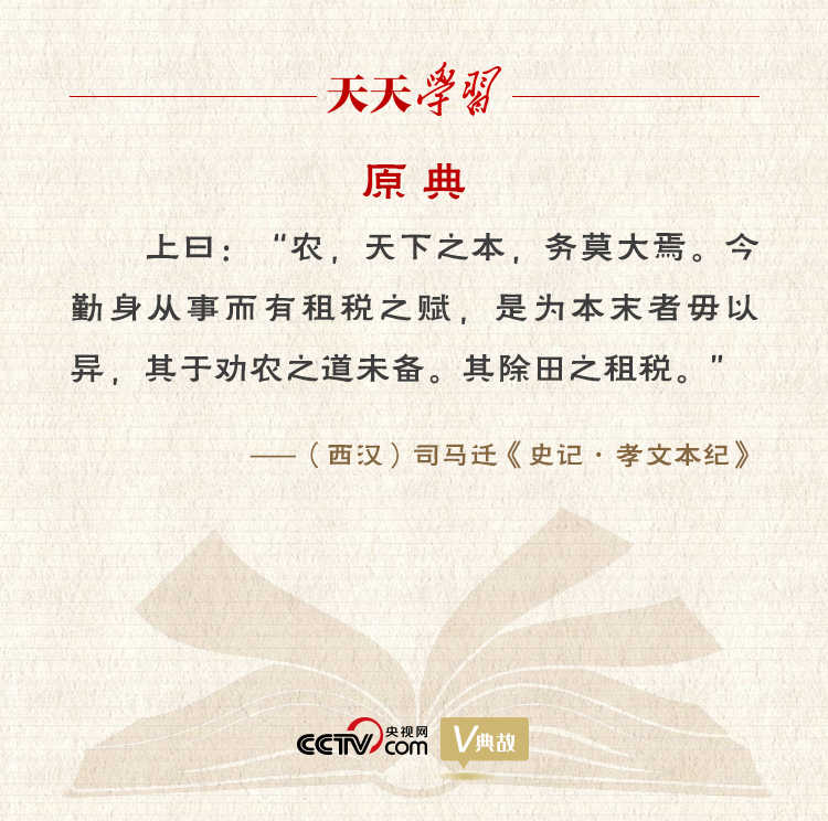 “农,天下之本,务莫大焉”语出《史记·孝文本纪》,意思是农业是国家的根本,是最重要的事情。