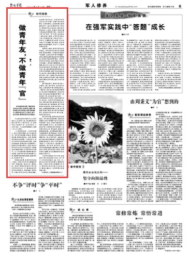 ●怀着信任欣赏,做青年官兵的知心朋友;经常培土施肥,做青年官兵的良师益友;勤于修枝剪叶,做青年官兵的人生诤友;敢于放手历练,做青年官兵的并肩战友