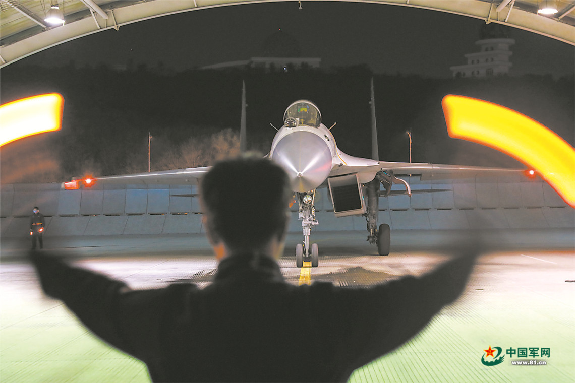 夜幕降临,机务官兵完成检查维护、油料补给后,战机再次腾空而起……