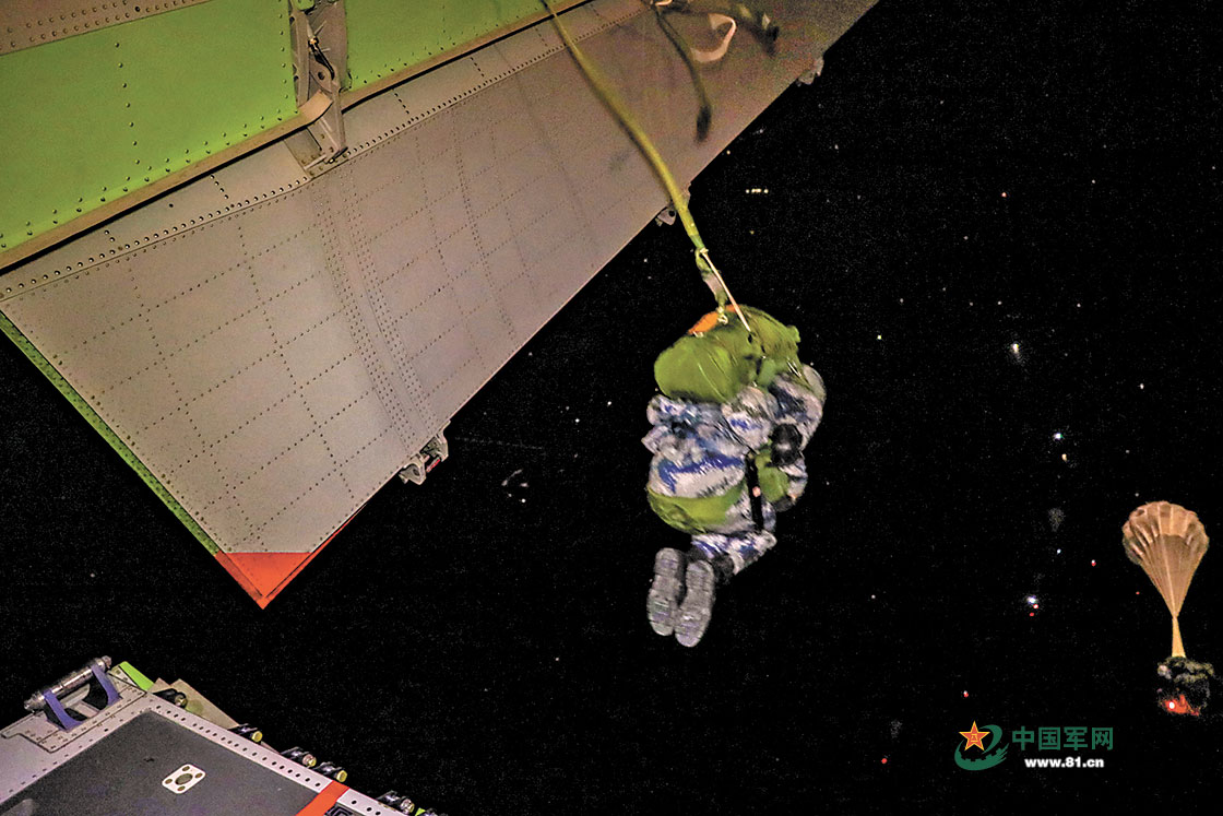 面对茫茫夜空,参训官兵勇敢跃出机舱。
