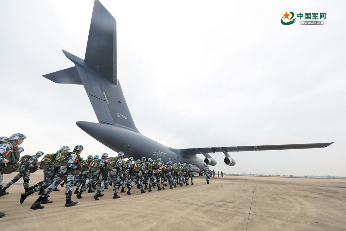 “登机!”机场指挥员一声令下,伞兵们紧张有序登上飞机。很快,伴着巨大的轰鸣声,多架运输机成战斗编队腾空而起,向预定空域隐蔽突进。到达预定空降场上空,舱门徐徐打开,一股凉风吹进机舱,广阔苍穹尽收眼底。