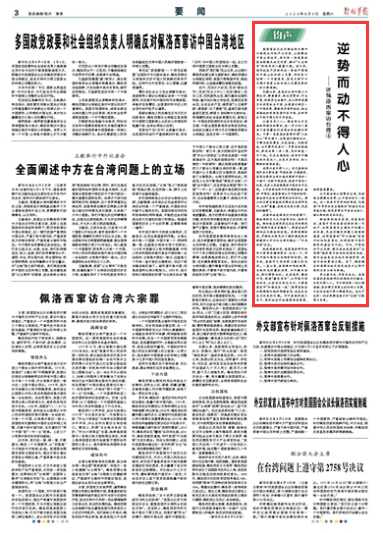 逆势而动不得人心。在巴基斯坦国际法专家哈桑·阿斯拉姆·沙德看来,美国企图将台湾打造成遏制中国的一个棋子,试探中国底线,挑战中国核心利益,本质上是妄图遏制中国的和平发展。土耳其前驻华外交官穆斯塔法·诺扬·罗拿说,美国要停止对中国的挑衅,佩洛西不会给台湾带来任何好处。澳大利亚前总理基廷在窜访发生前即表示,此举“愚蠢、危险且没有必要,是危险的赌博”。