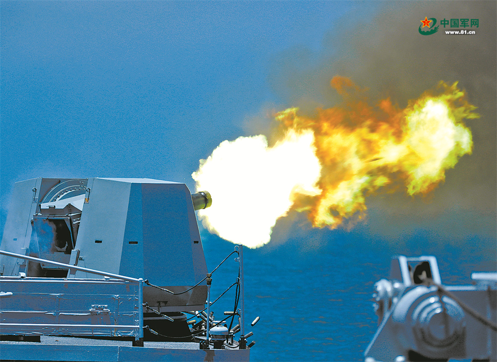 指挥员快速研判战场态势,下达一道道指令。少顷,目标锁定,编队指挥舰果断发射干扰弹,并在舰艉释放烟幕,其他舰艇高速机动进行防御规避。在干扰弹的掩护下,编队各舰副炮展开射击,一条条火舌喷涌而出,成功拦截空中目标。