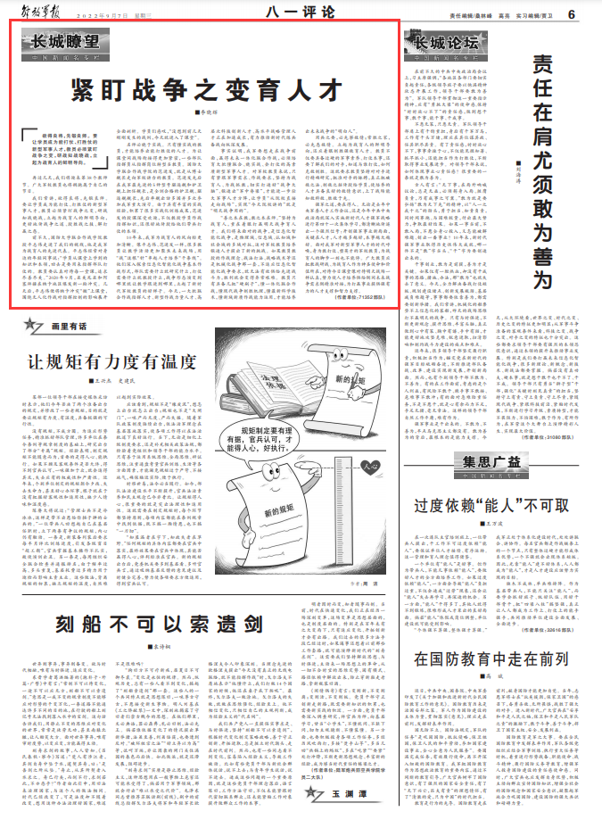 事实证明,我军要想走在战争前面,赢得未来一体化联合作战,必须培育大批懂联合、晓实战、会打仗的高素质新型军事人才。对军校教员来说,只有紧跟军事需求、作战要求,坚持为战育人、为战抓教,切实打造好“战争大脑”、锻造出“军中脊梁”,才能进一步壮大军事人才方阵,让学员“从院校直接走向战场”,实现“今天院校讲的”就是“明天战争用的”。
