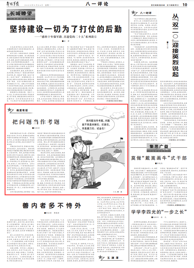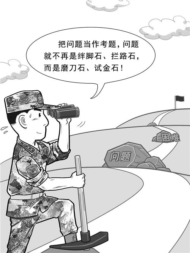 问题是时代的声音,考题来自问题。时代是出卷人,我们是答卷人。强军实践中的每个问题都是考题,都需要用行动作答、让官兵评判。因此,把问题当作考题来对待,有利于自我加压、履职尽责,深化对问题的研究分析,督促推进整改落实。
