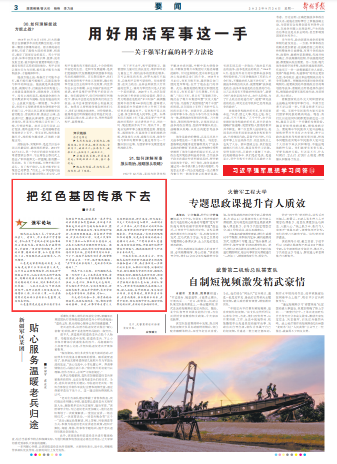 行之苟有恒,久久自芬芳。传承红色基因作为新时代政治建军的战略任务和基础工程,要求各级进一步强化政治责任,加强组织领导,统筹规划部署,切实把红色资源利用好,把红色传统发扬好,把红色基因传承好,推动形成全方位的红色基因传承格局。每名官兵都应赓续红色血脉,当好红军传人,更加自觉地把红色基因植入灵魂、融入血脉,在学好理论、坚定信念中传承,在爱军精武、履职尽责中传承,在崇尚英雄、争当英雄中传承,在勇于创新、续写辉煌中传承,把好传统带进新征程,在新时代弘扬好作风。