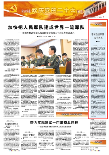 党的二十大报告指出,如期实现建军一百年奋斗目标,加快把人民军队建成世界一流军队,是全面建设社会主义现代化国家的战略要求。新的征程上,我们要涵养实干的品格,保持实干的姿态,勇做朝乾夕惕的行动者、不务空名的实干家,时刻从严要求、处处实字当头,紧扣实现建军一百年奋斗目标拼搏进取,瞄着全面建成世界一流军队奋力攻坚,铸就新的强军伟业,争取新的更大光荣。
