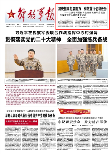 在全党全国全军认真学习宣传贯彻党的二十大精神之际,习主席带领军委一班人视察军委联合作战指挥中心,亮明新一届军委贯彻落实党的二十大精神、全面加强练兵备战的决心态度。习主席视察时发表的重要讲话,深刻阐明了加快提高打赢能力、有效履行新时代我军使命任务一系列带根本性方向性全局性的重大问题,突出强调了军委联合作战指挥中心的独特地位作用,必将进一步把全军思想和行动统一到党的二十大精神上来,激励和感召广大官兵踔厉奋发、勇毅前行,奋力实现建军一百年奋斗目标,在新时代新征程上赢得更加伟大的胜利和荣光。