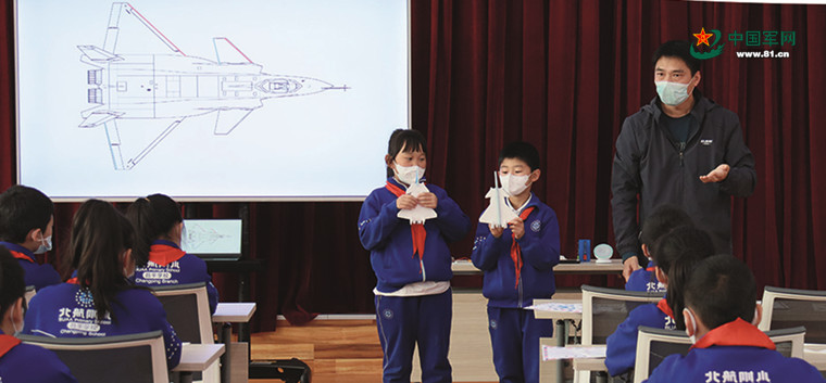11月3日,北京航空航天大学附属小学昌平学校学生在学校开设的《隐身战机设计师》课程中,展示设计的隐身战机模型。杨晓翠摄