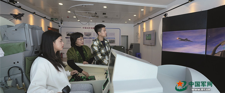 10月10日,沈阳理工大学学生在兵器博物馆体验战机模拟操控系统。孙立刚摄