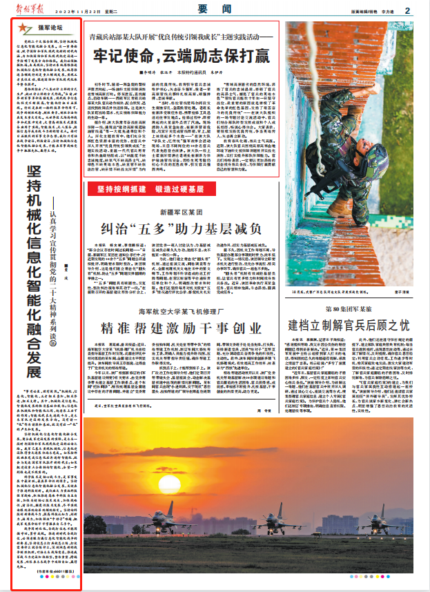 党的二十大报告强调,坚持机械化信息化智能化融合发展。这一重要论述,赋予国防和军队现代化新的时代内涵,为加快国防和军队现代化建设进一步指明了发展方向和路径。我们必须把握机遇,立足现状,坚持以系统思维推进机械化信息化智能化融合发展,统筹推进各领域特别是重点领域发展,实现三者良性互动,促进国防和军队现代化水平整体提升。