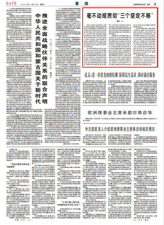疫情就是命令,防控就是责任。“三个坚定不移”,是党中央科学判断当前国内外疫情形势对我国疫情防控工作提出的明确要求,也是被近3年来我国疫情防控实践反复证明的正确选择。我们要进一步提高政治站位,完整、准确、全面贯彻落实党中央决策部署,充分认识优化调整防控措施不是放松防控,更不是放开、“躺平”,而是适应疫情防控新形势和新冠病毒变异的新特点,坚持既定的防控策略和方针,进一步提升防控的科学性、精准性。要毫不动摇贯彻“三个坚定不移”,坚持第九版防控方案、落实二十条优化措施,既要反对不负责任的态度,又要反对和克服形式主义、官僚主义,纠正“层层加码”“一刀切”等做法,因地制宜、科学精准开展防控工作,刻不容缓、以快制快,推动各项措施落地见效。