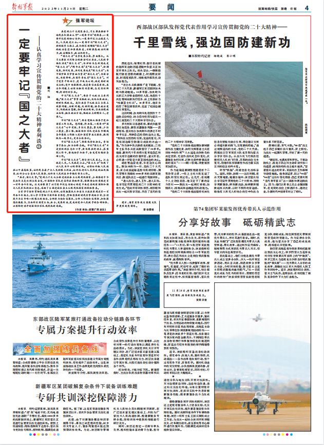 “兵者,国之大事。”党的二十大从全面建设社会主义现代化国家、全面推进中华民族伟大复兴的全局出发,对国防和军队建设作出战略部署,强调要如期实现建军一百年奋斗目标。这充分彰显了以习近平同志为核心的党中央建设巩固国防和强大人民军队的决心意志,反映了全面建设社会主义现代化国家的战略要求。