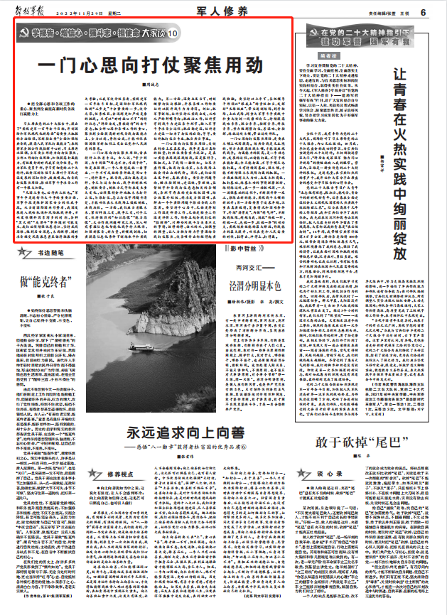 习主席在党的二十大报告中,提出了“实现建军一百年奋斗目标,开创国防和军队现代化新局面”需要重点把握的方法路径,深刻指出要“全面加强练兵备战,提高人民军队打赢能力”;在视察军委联合作战指挥中心时,习主席再次强调,全军要全部精力向打仗聚焦,全部工作向打仗用劲,加快提高打赢能力,有效履行新时代我军使命任务。作为军队党员干部,学习贯彻党的二十大精神,就要深刻体悟习主席对于军队建设发展的深切期许、殷殷嘱托,向备战打仗聚焦用劲,推动军事斗争准备工作有一个很大加强。