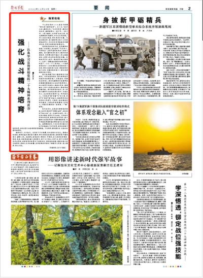 习主席在党的二十大报告中强调“强化战斗精神培育”。古人云:“胜负之征,精神先见。”无论是革命、建设还是改革,都需要那么一股子气、一股子劲、一股子精神,正所谓“远征之前,首先要擦亮的是精神,而不仅仅是武器。”军人生来为战胜,军队存在为打赢。无数实践表明,战斗精神作为战斗力的重要组成部分,不仅是关系作战胜负的精神支柱,更是克敌制胜的重要法宝。