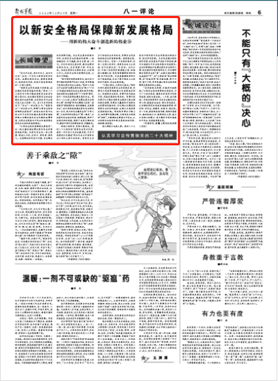 “宜将剑戟多砥砺,不教神州起烽烟。”以新安全格局保障新发展格局,对于广大官兵来说,最根本的就是平时强军备战,战时决战决胜。一方面,我们要进一步做好保持部队自身安全稳定的各项工作,提高政治站位、强化责任担当,以过硬的作风和有效的措施强管理、防风险、促安全,保稳定、抓落实、谋发展。另一方面,要坚持底线思维,增强忧患意识,练好胜战之功,保持待发之势,真正以更强大的能力、更可靠的手段打造高水平安全、促进高质量发展。