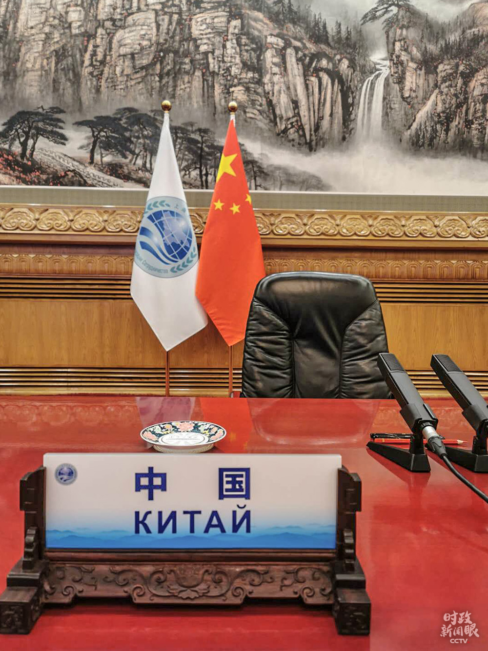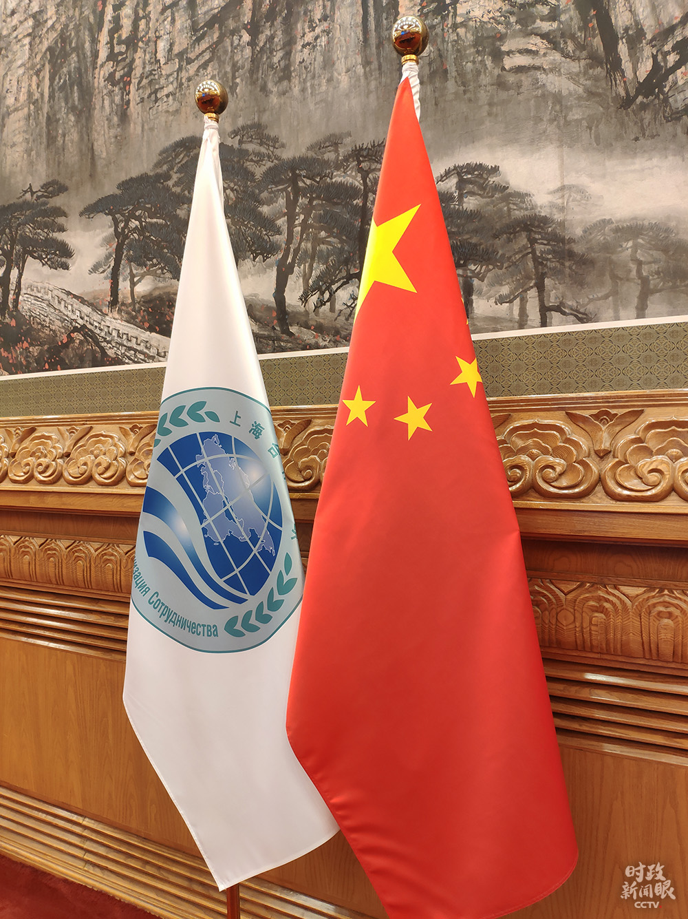 △会场内摆放的中国国旗和上海合作组织旗帜(总台央视记者耿小龙拍摄)