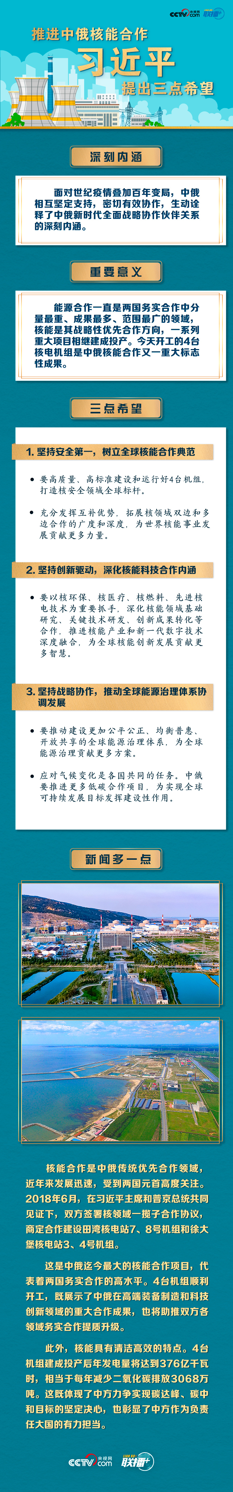 “今年是《中俄睦邻友好合作条约》签署20周年。我同普京总统商定,将在更高水平、更广领域、更深层次推进双边关系向前发展。”5月19日,习近平主席在北京通过视频连线,同俄罗斯总统普京共同见证两国核能合作项目——田湾核电站和徐大堡核电站开工仪式。