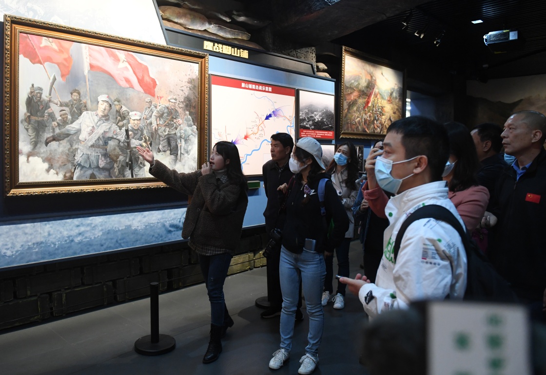 在广西桂林全州县红军长征湘江战役纪念馆,胡雅馨(左一)在讲解长征历史(4月26日摄)。新华社记者 陆波岸 摄