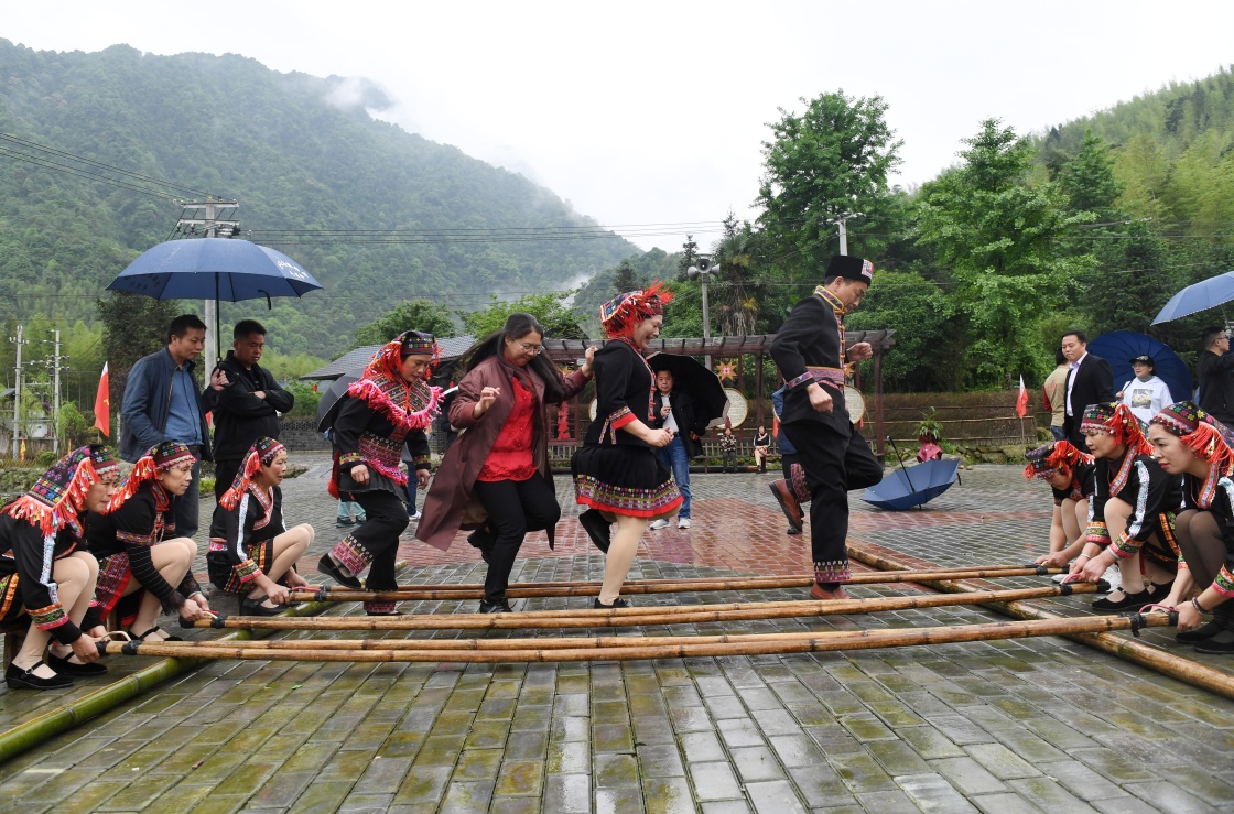 在广西兴安县华江瑶族乡龙塘寨,当地村民和游客一起跳竹竿舞(4月28日摄)。新华社记者 陆波岸 摄