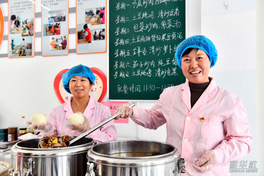 ↑在东营市垦利区杨庙社区养老服务中心,工作人员为老人盛午餐(10月18日摄)。