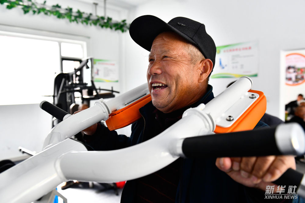 ↑在东营市垦利区杨庙社区养老服务中心,65岁的盖景献在锻炼身体(10月18日摄)。