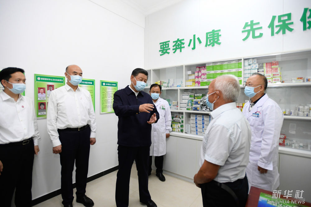 ↑9月14日下午,习近平在陕西省榆林市绥德县张家砭镇郝家桥村卫生站同村里的老人、医护人员亲切交流。