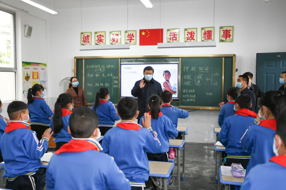 2020年4月21日,习近平来到陕西省安康市平利县老县镇,在中心小学考察脱贫攻坚情况。新华社记者 谢环驰 摄