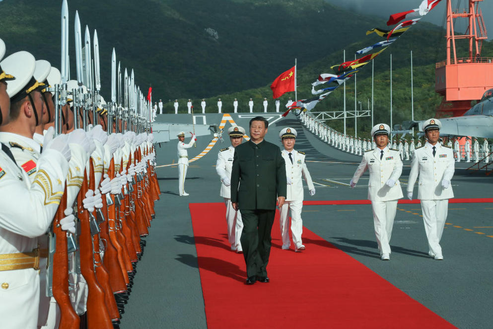 2019年12月17日,我国第一艘国产航空母舰山东舰在海南三亚某军港交付海军。习近平出席交接入列仪式并登舰视察。这是仪式结束后,习近平登上山东舰,检阅仪仗队。新华社记者 李刚 摄