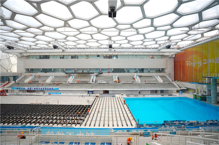 △施工人员在“水立方”进行冰场可转换结构施工。