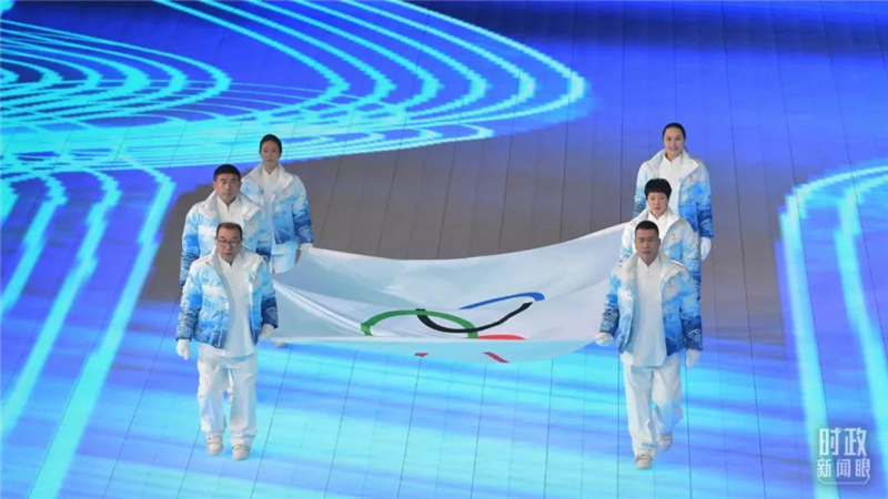 △北京冬奥会开幕式上,6名旗手手执奥林匹克会旗入场。(总台记者廖江衡拍摄)