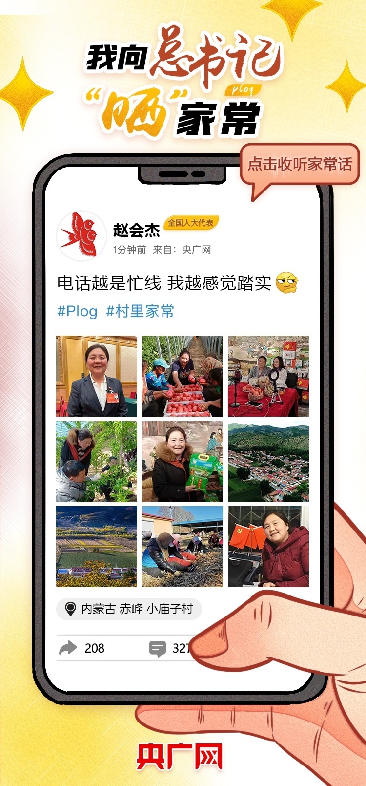 2022年全国两会,央广网推出特别策划《我向总书记“晒”家常》,讲述基层代表委员牢记嘱托、履职参政的故事。