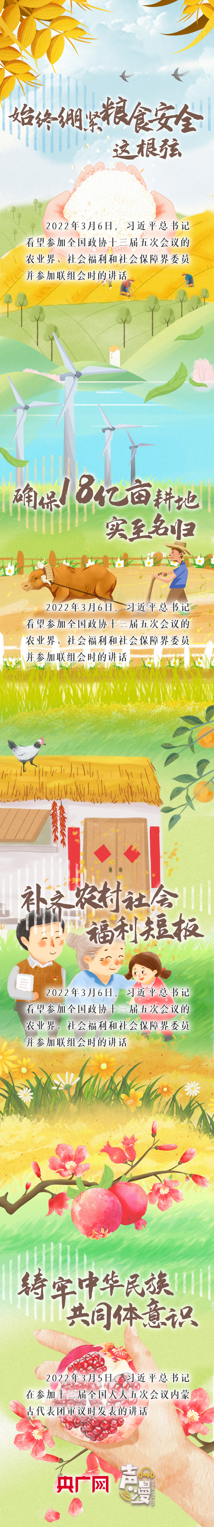2022年全国两会期间,习近平总书记多次“下团组”,同代表委员们深入交流、共商国是,“始终绷紧粮食安全这根弦”“确保18亿亩耕地实至名归”“补齐农村社会福利短板”“铸牢中华民族共同体意识”……习近平总书记一系列重要讲话,凝聚着人民的心声,饱含着群众的期盼,让我们一起聆听!