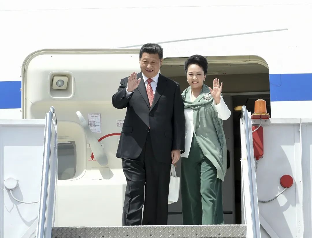 2015年4月20日,国家主席习近平抵达伊斯兰堡,开始对巴基斯坦进行国事访问。图为习近平主席和夫人彭丽媛向欢迎人群挥手致意。新华社记者 李学仁 摄