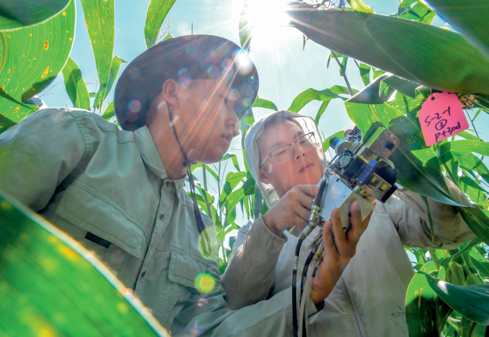 图片在吉林省梨树县,中国农业大学在读博士生沙野(右)和崔帅在试验田里测量玉米光合作用(2022年8月17日摄) 张楠摄 / 本刊