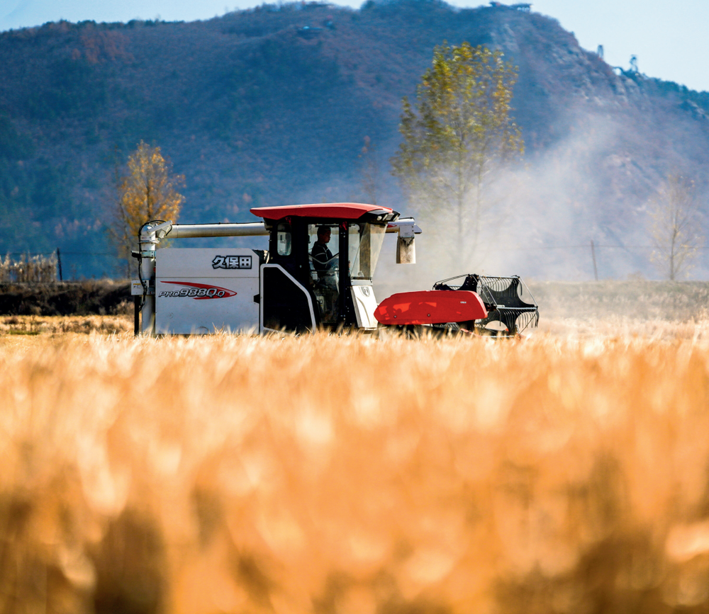 图片在吉林省延边朝鲜族自治州和龙市光东村,农民驾驶农机收割水稻(2022年10月23日摄) 颜麟蕴摄 / 本刊