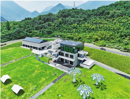 图为余村未来图书馆,该建筑主要通过铺设在屋顶上的光伏发电系统和“光伏树”供电(无人机照片)。新华社记者 翁忻旸 摄