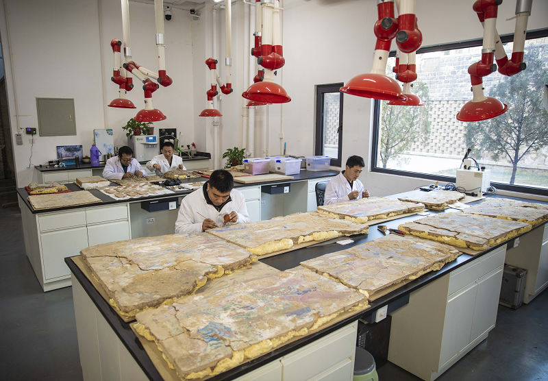 云冈研究院壁画修复师正在进行修复工作。人民网记者 王帆摄