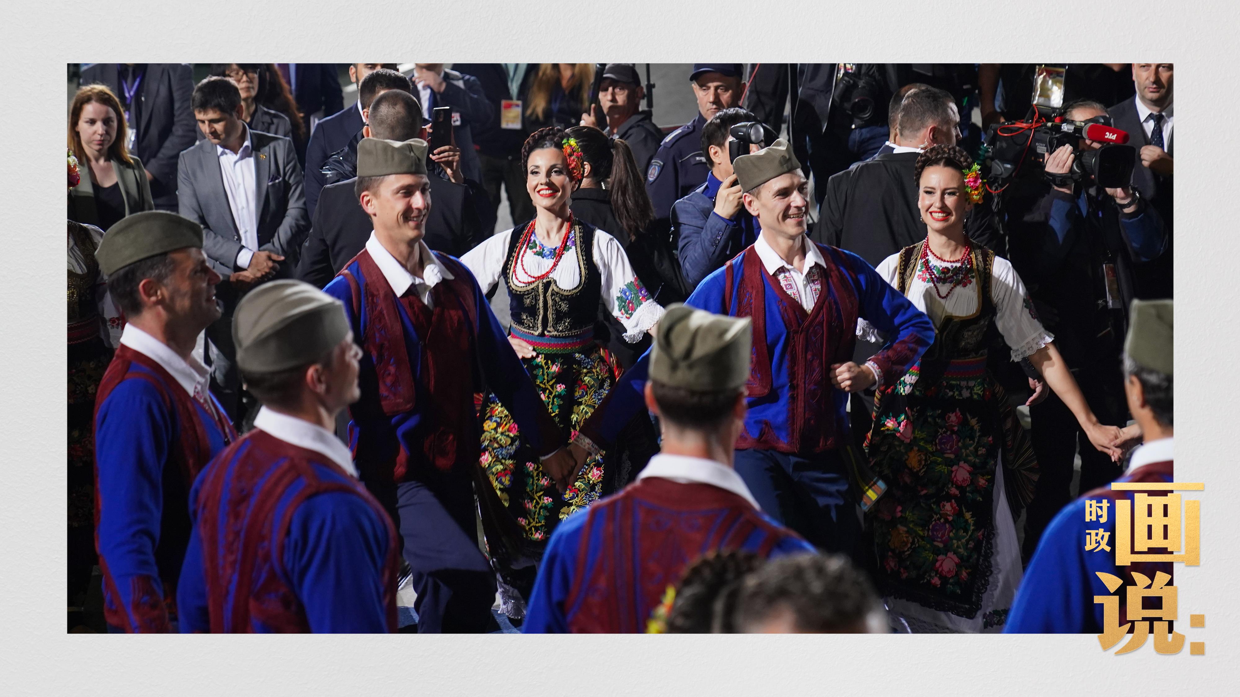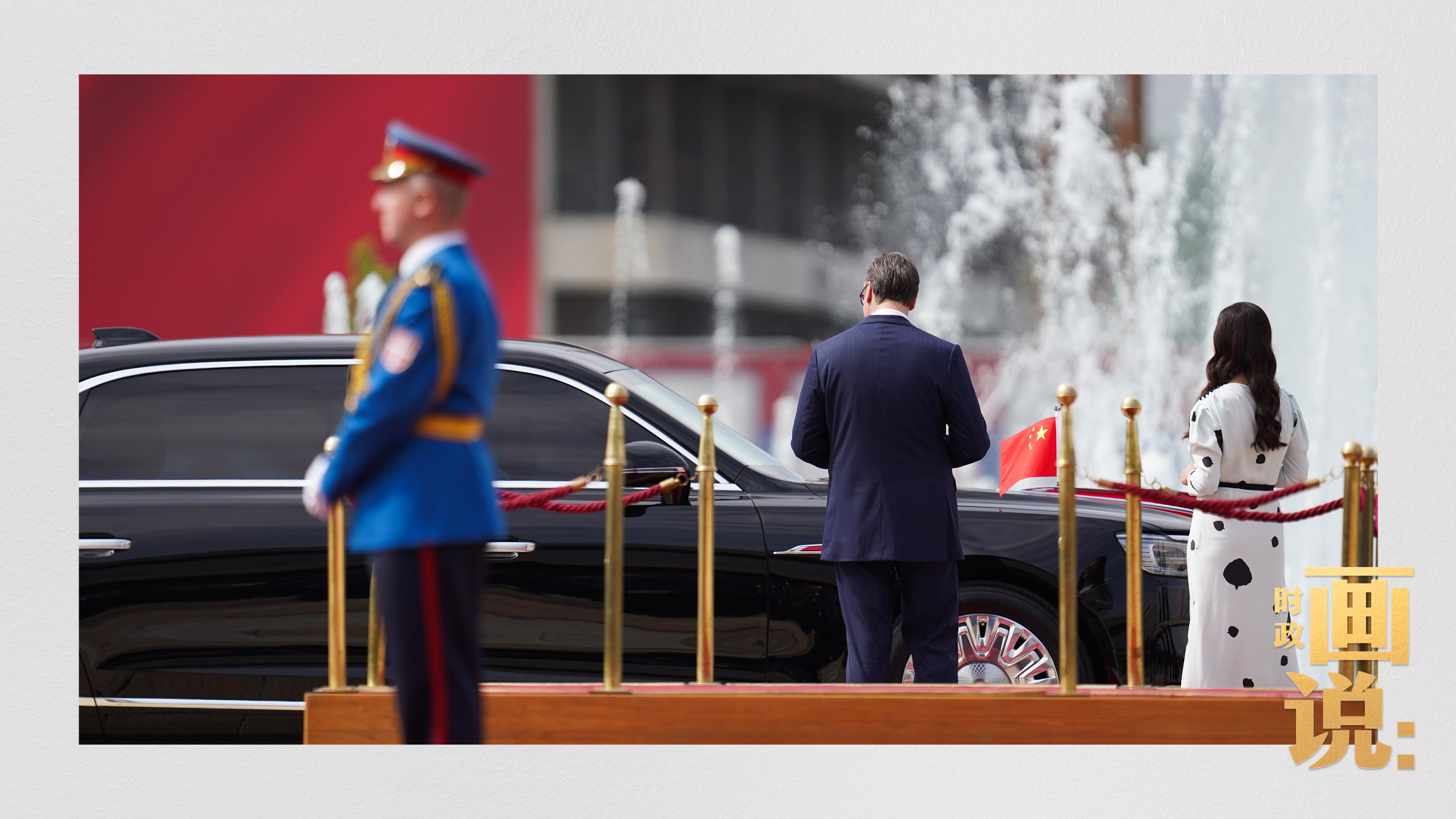 塞尔维亚大厦前广场,塞尔维亚总统武契奇和夫人塔玛拉在下车处热情迎接习近平和夫人彭丽媛。