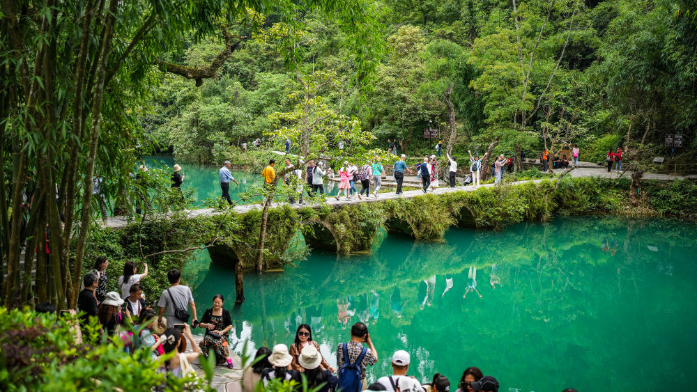 初夏时节,贵州省黔南布依族苗族自治州荔波县小七孔景区绿意盎然、风光秀美,吸引众多游客前来观光游玩。新华社记者 陶亮 摄