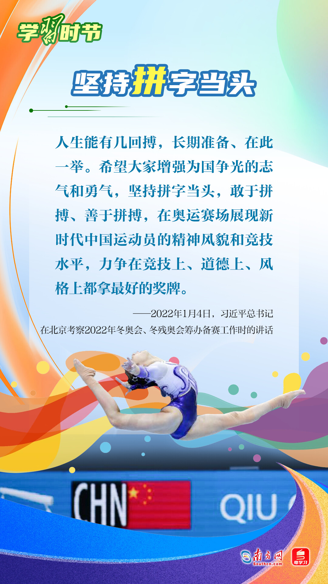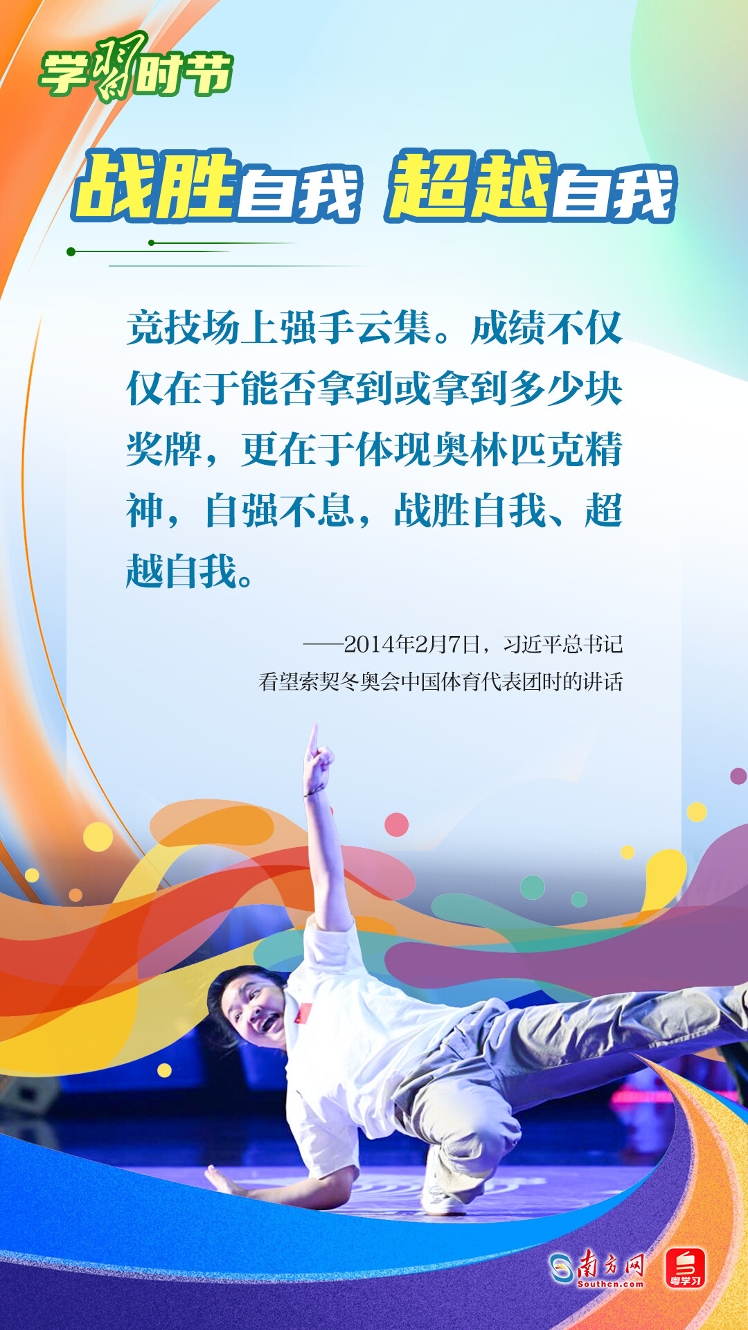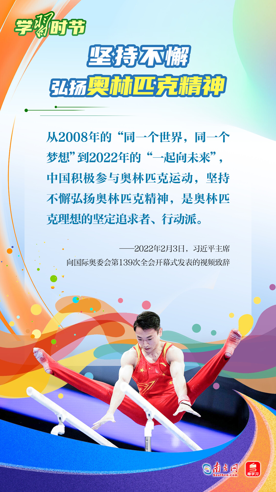 “我们不以胜负论英雄,同时英雄就要敢于争先、敢于争第一。”习近平总书记曾在不同场合论述奥林匹克精神,深刻阐明了胜与负、成与败的辩证关系,对奥林匹克“更快、更高、更强——更团结”的格言进行诠释。让我们一同学习习近平总书记对奥林匹克精神的重要论述,心怀梦想、奋勇拼搏,携手走向美好明天。