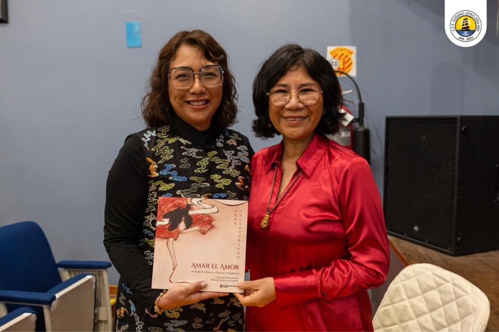 2024年9月24日,秘鲁汉学家帕特里西亚·卡斯特罗(右)和秘鲁若望二十三世秘中学校校长珍妮弗·帕扬(左)共同展示卡斯特罗的新作《中国古代38位女诗人作品选》。(受访者提供)