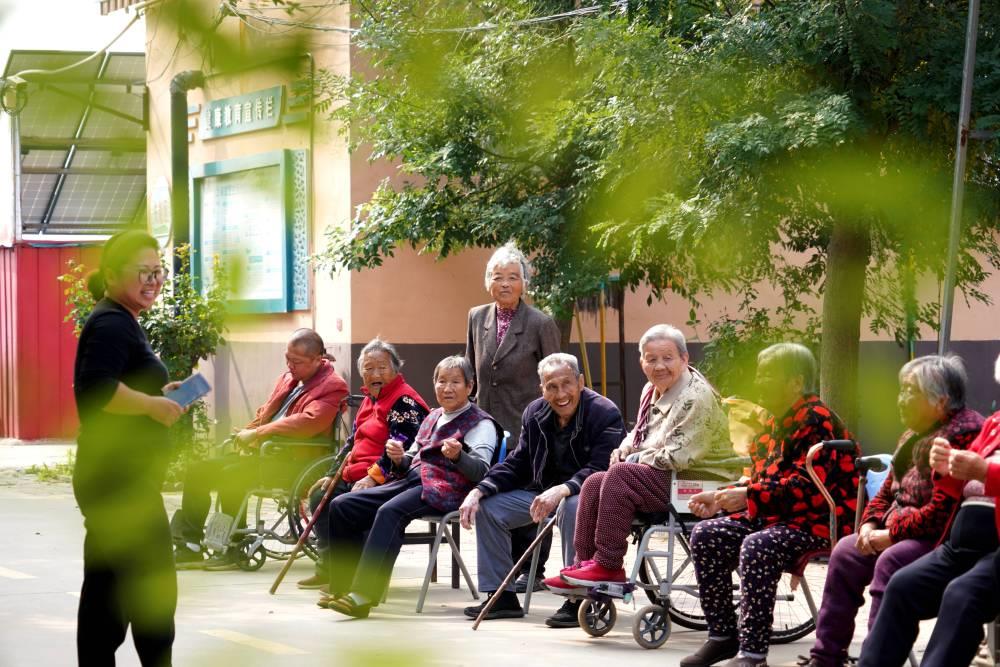 △2024年10月8日,在河北巨鹿县南大韩村菘乐医养中心,工作人员陪同老人散心。