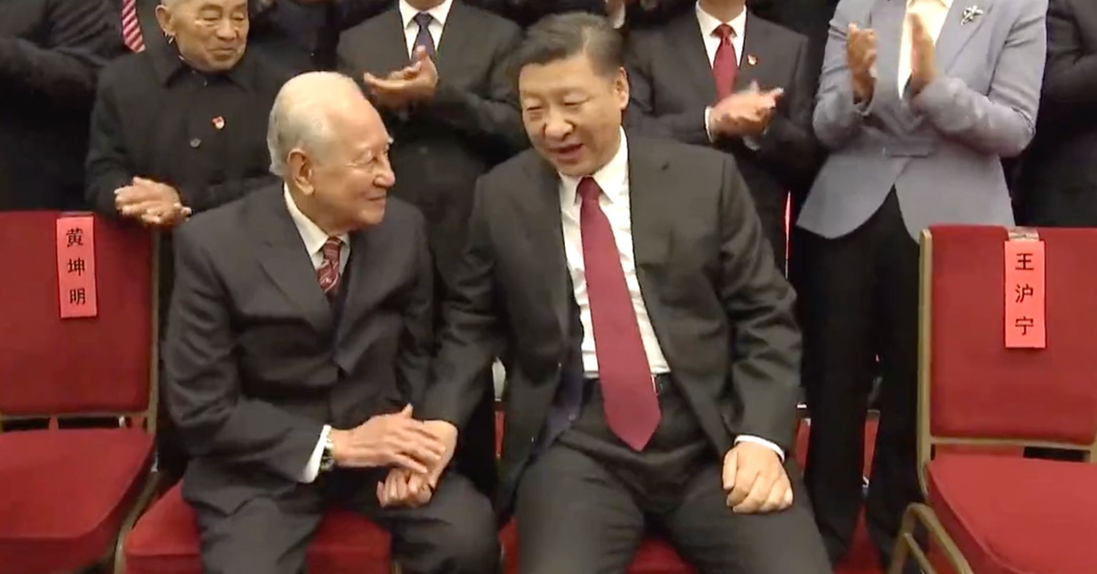 看到老人们年事已高,总书记上前挪开前排的椅子,握住黄老的手,邀请他坐到自己身旁。“你们这么大岁数,身体还不错。你们别站着了,到我边上坐下。”
